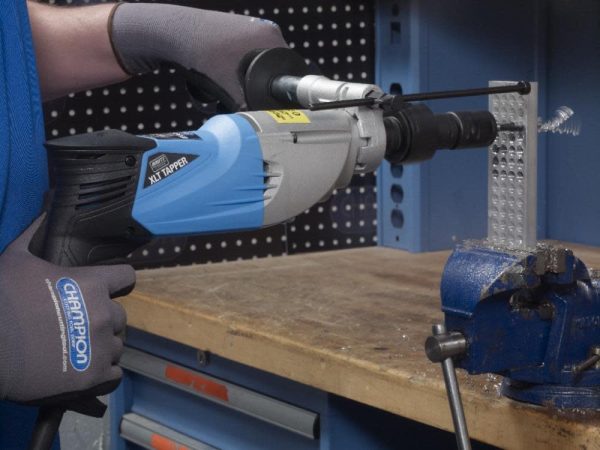 Champion cutting tool’s Brute Platinum XLT tapper was designed to increase tapping productivity when threading large amounts of holes in ferrous and non-ferrous metals. Outperforming the traditional way of tapping, the XLT tapper taps holes 10X faster than handheld tapping using a tap wrench. The XLT tapper is the perfect tool for various industries including steel fabrication, elevator maintenance, mo and more. Specifically engineered for heavy duty applications, the XLT tapper can tap steel/ferrous materials up to 9/16 In. (14 mm) and aluminum/non-ferrous materials up to 5/8 In. (16 mm). High tech features such as, auto reverse, speed control, and pivoting tap collet reduce tap breakage saving you time and money on the job. With the operator in mind, the XLT tapper is easy to use and lightweight, featuring a depth-stop to control threading depth, and includes a spindle clutch for safer jam-free tapping. For optimal performance, Brute Platinum XL22 spiral point taps and RotoBrute cutting fluid are recommended for fast and easy tapping. The XLT tapper is proudly part of the Brute Platinum family at Champion cutting tool-heavy duty tools for your heavy duty jobs!