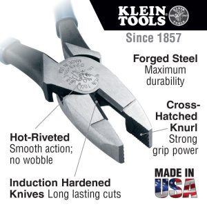 These Lineman’s Side-Cutting pliers feature induction hardened cutting knives for long life. The 2000 series blades are designed for heavy-duty cutting of ACSR, screws, nails, and most hardened wire. The high-leverage design provides 46-Percent greater cutting power than other plier designs. Exclusive handle tempering absorbs the “snap” when cutting wire. Pick up these Klein’s and feel the difference. For more than 160 years, Klein Tools has manufactured premium-quality, professional-grade hand tools that deliver the performance, durability and precision needed to get the job done right. Our family of engineers, workers and craftsman continue to put six generations of expertise into every tool we create by using only the highest quality materials, superior workmanship, and keeping manufacturing as close to home as we can. Klein isn’t just the name of our company, it’s also our family name. And since we’re an American company that’s family-owned and family-run, you know you can count on us to be here tomorrow. Klein Tools doesn’t just make great products, we make great products that stand up to the demands of the professionals who use them every day … Since 1857.