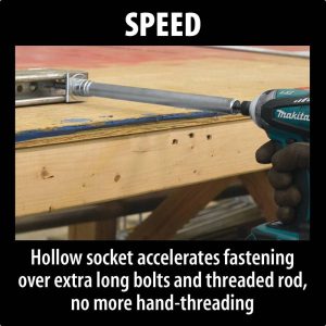 Impact and drill-ready hollow socket design saves time and speeds up fastening applications over extra long bolts, studs and threaded rod