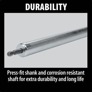 Axial press-fit 1/4 in. hex shank provides greater durability and torsional strength compared to a one-piece hollow socket